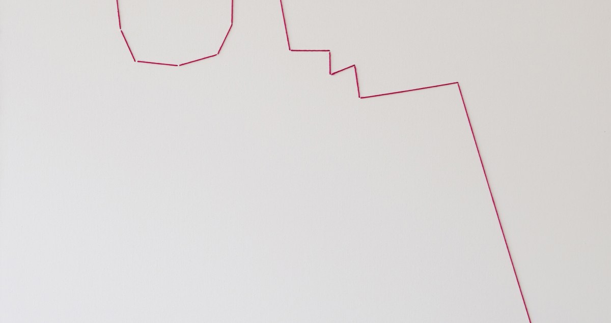 Un parcours quotidien dont on se souvient, puis retranscrit en lignes droites sur papier, agrandi et cousu sur toile. Une sorte de labyrinthe mémorisé, où le fil nous guide pour retrouver la sortie. Une perception de l’espace par la mémorisation qui défit toute cartographie ou objectivité. Il est question du mouvement et d’une perception d’un trajet modifié par les impressions, émotions qui nous traversent et nous donnent le sentiment que de marcher de la station de métro à l’école, représente une distance beaucoup plus grande que le trajet en métro effectué à l’instant. Un trajet simplifié par une géométrie des lignes, rappelant les architectures rencontrées et intégrées (physiquement) d’un point à l’autre.