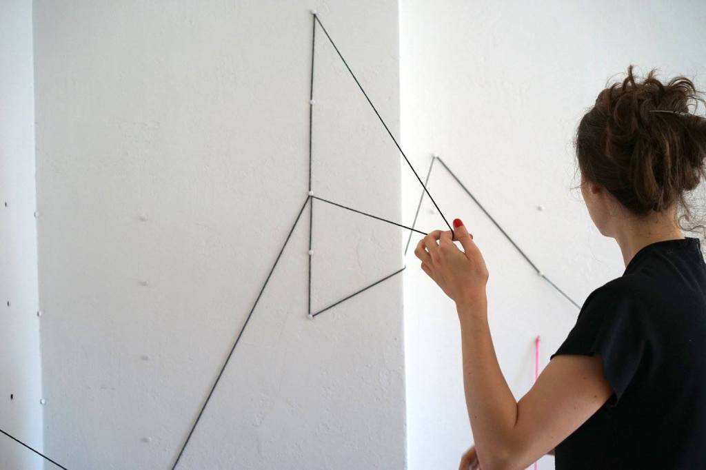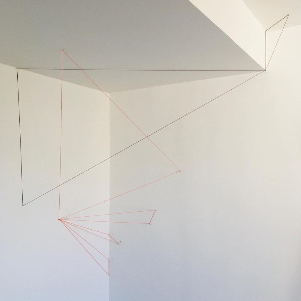 Les sculptures filaires ont vus le jour à la suite de ma recherche sur la ligne “Between the Lines #6”. C’est une sculpture qui résulte uniquement de triangles et qui s’intègre à l’architecture du lieu.
