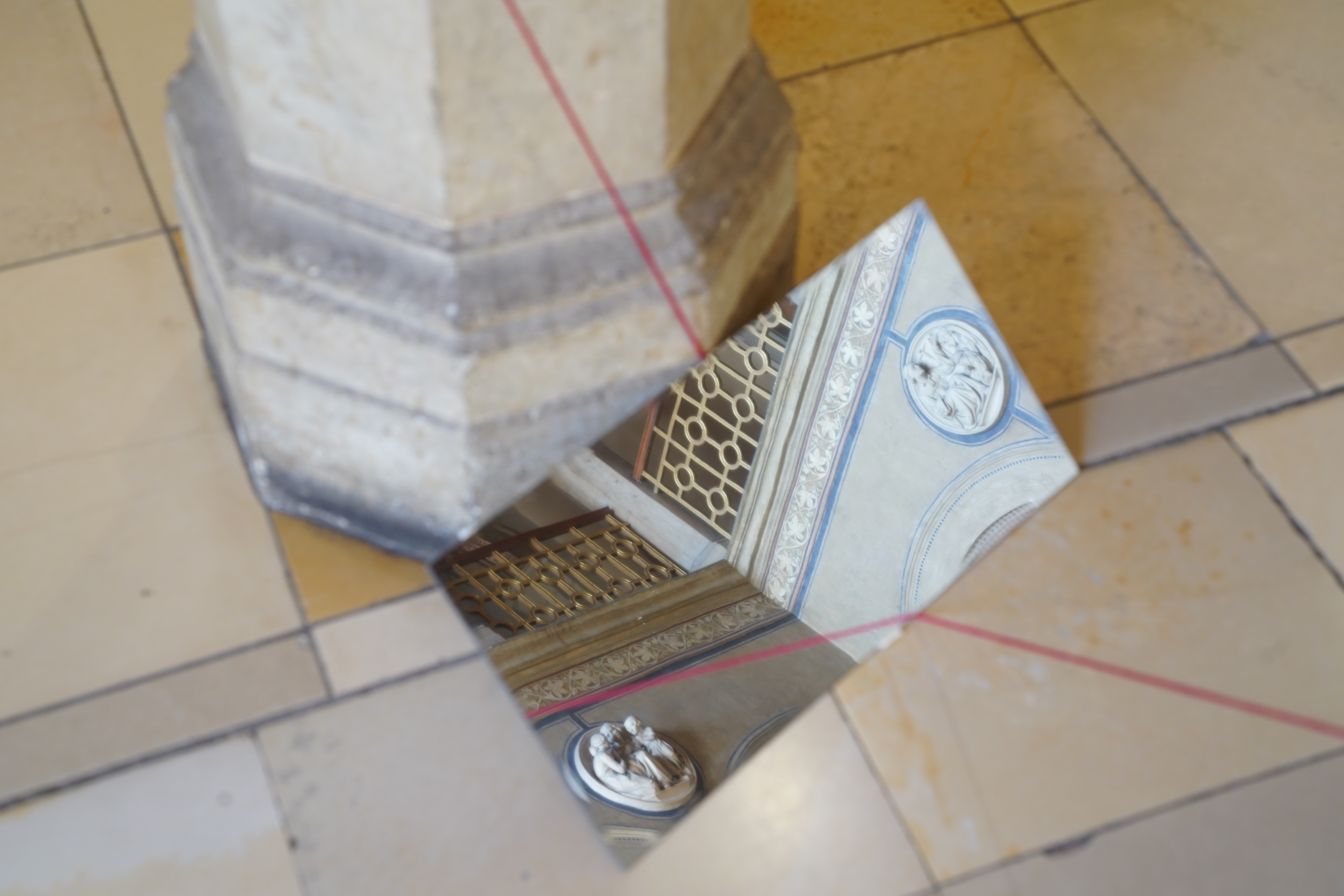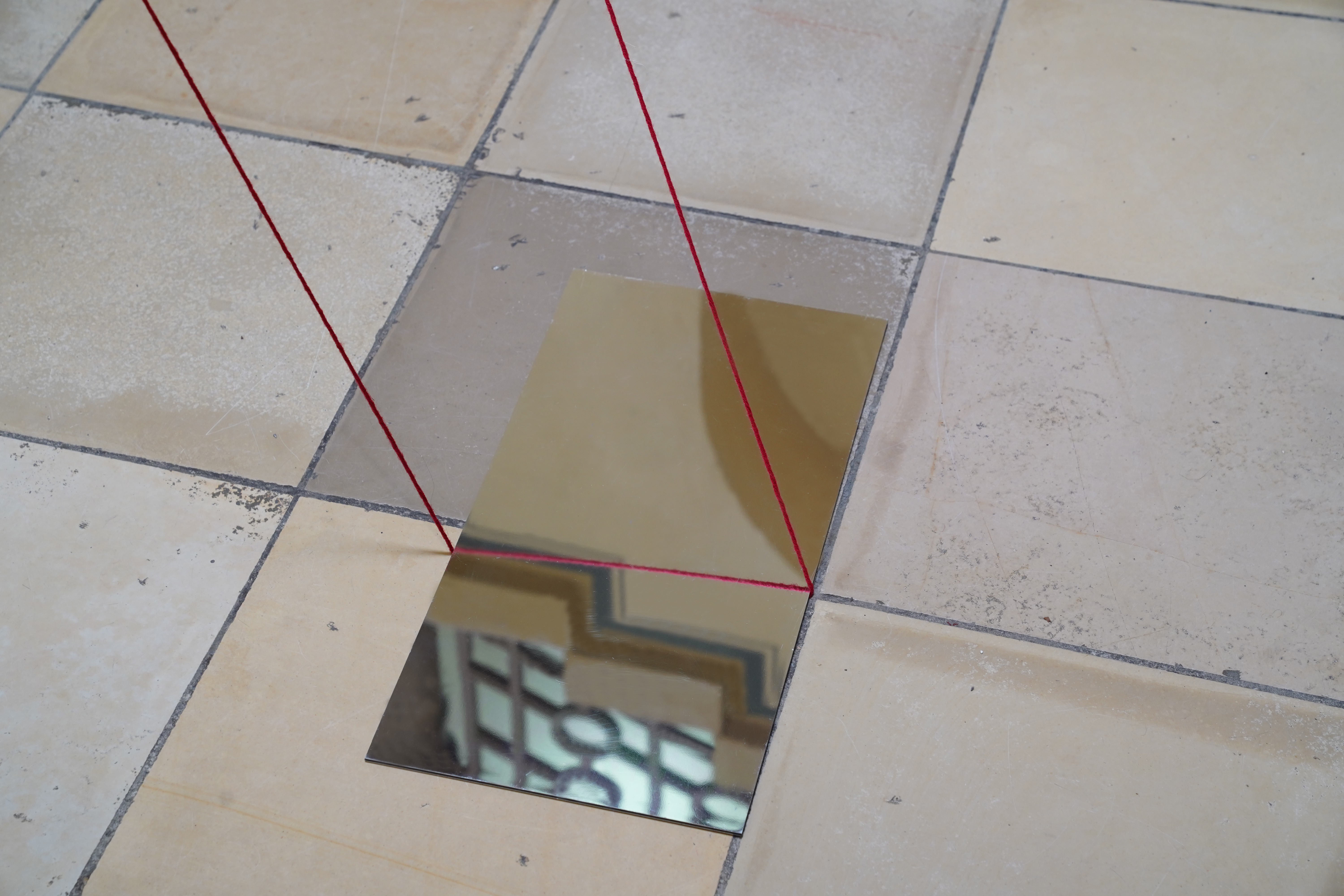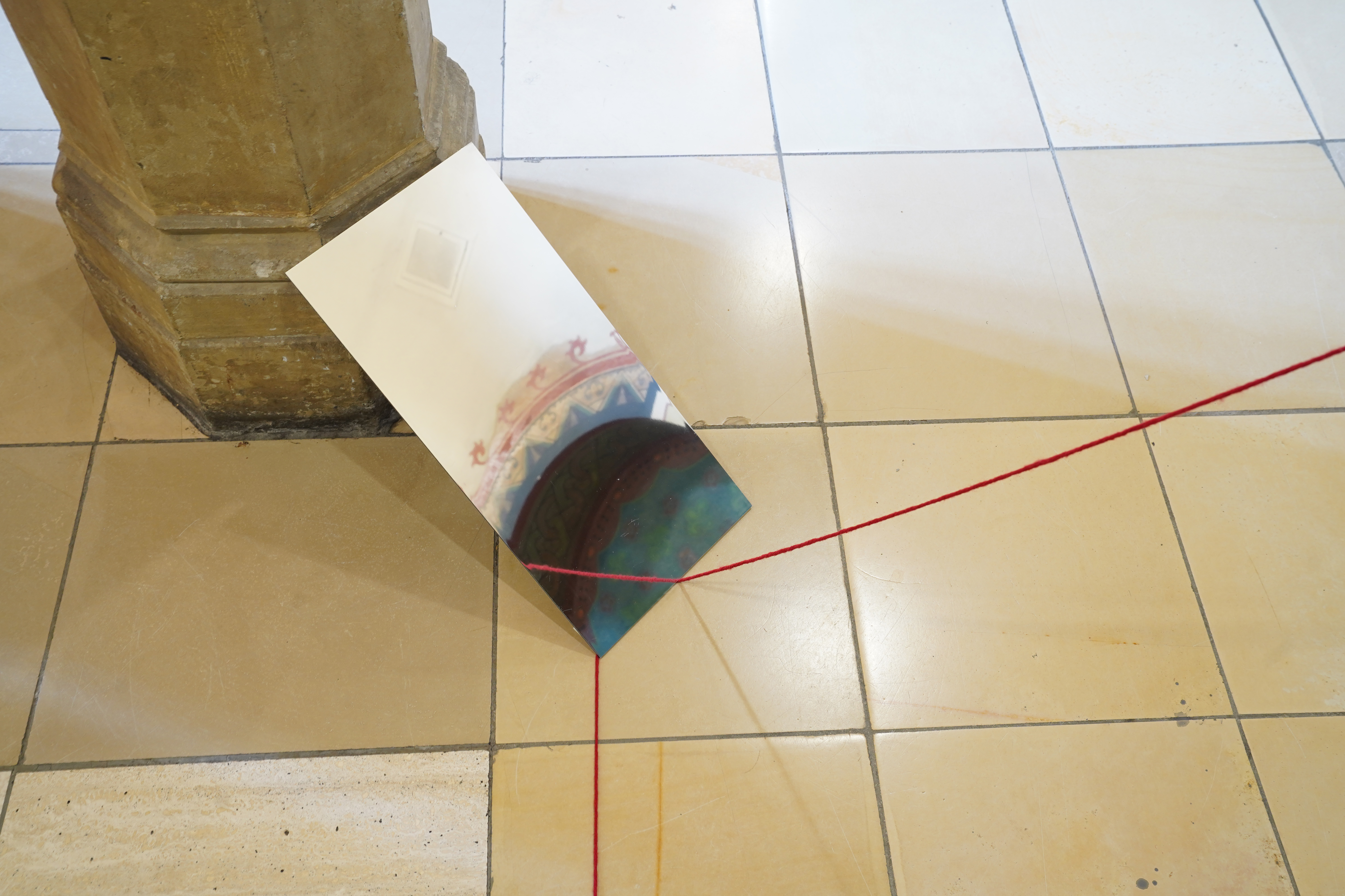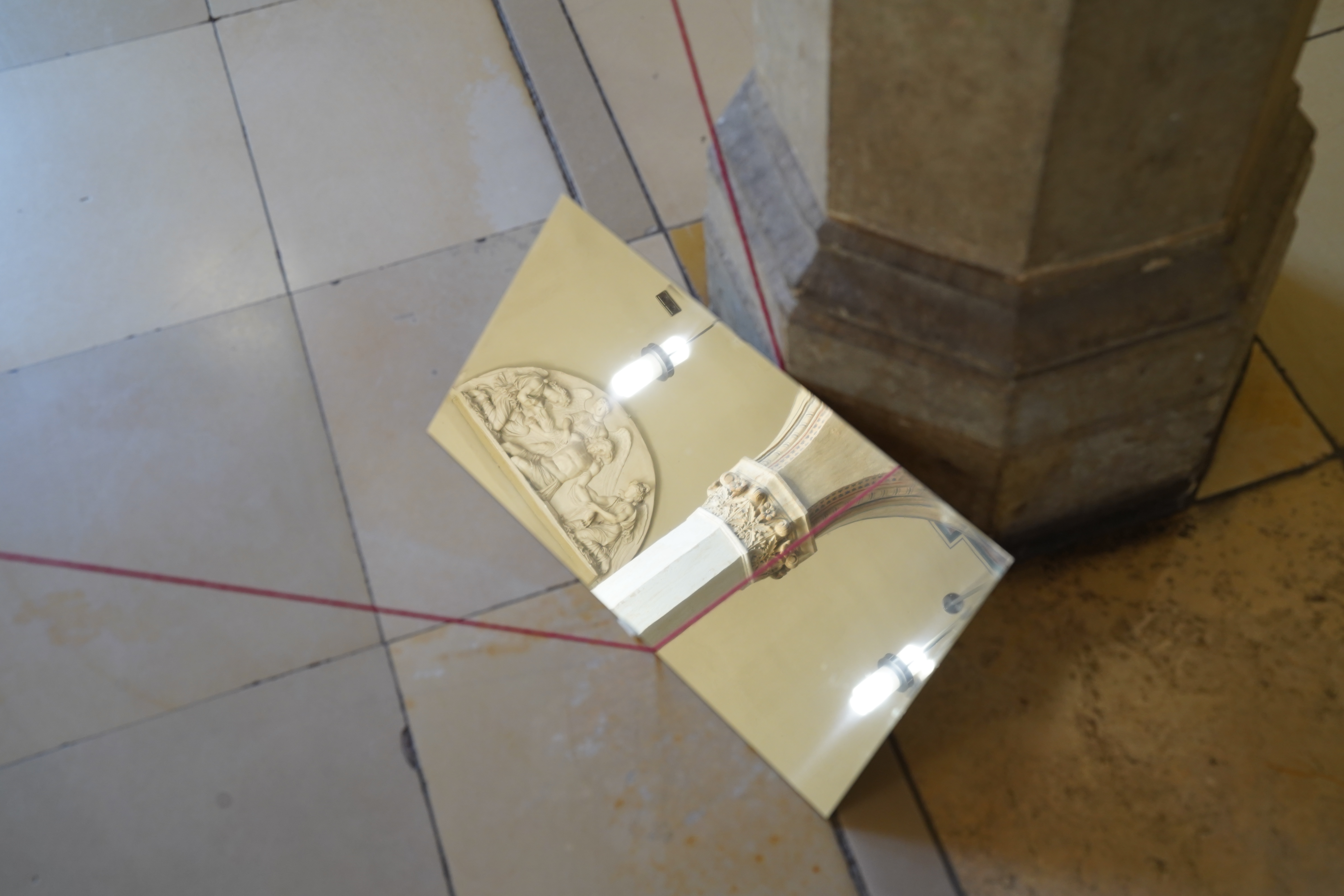 In this work she highlights fragments of the architecture of the site and its history. Through the use of mirrors, she also creates a re-reading of the space, extracting these architectural elements (reliefs, paintings, shapes, etc.) to make them visible elsewhere.