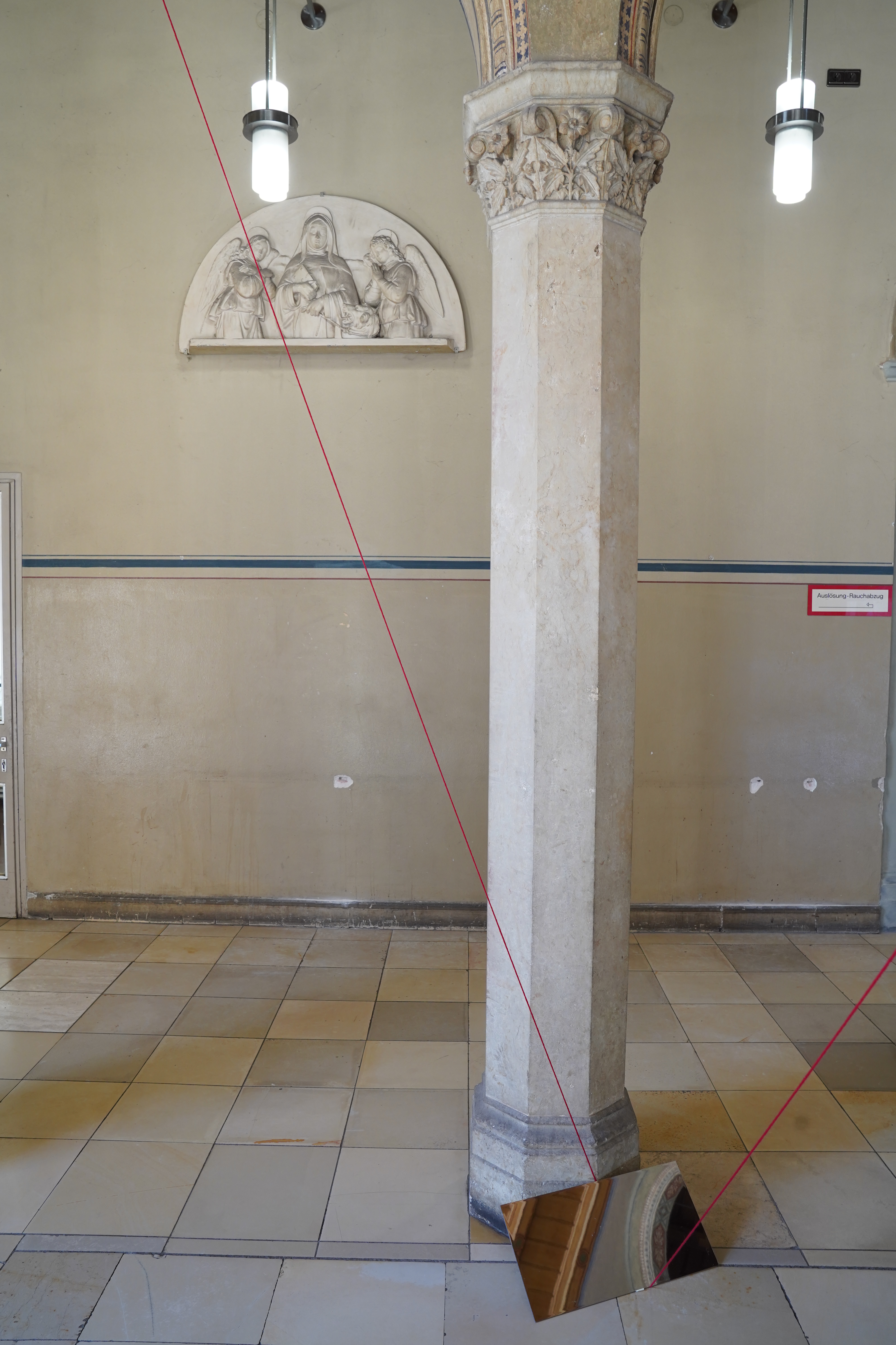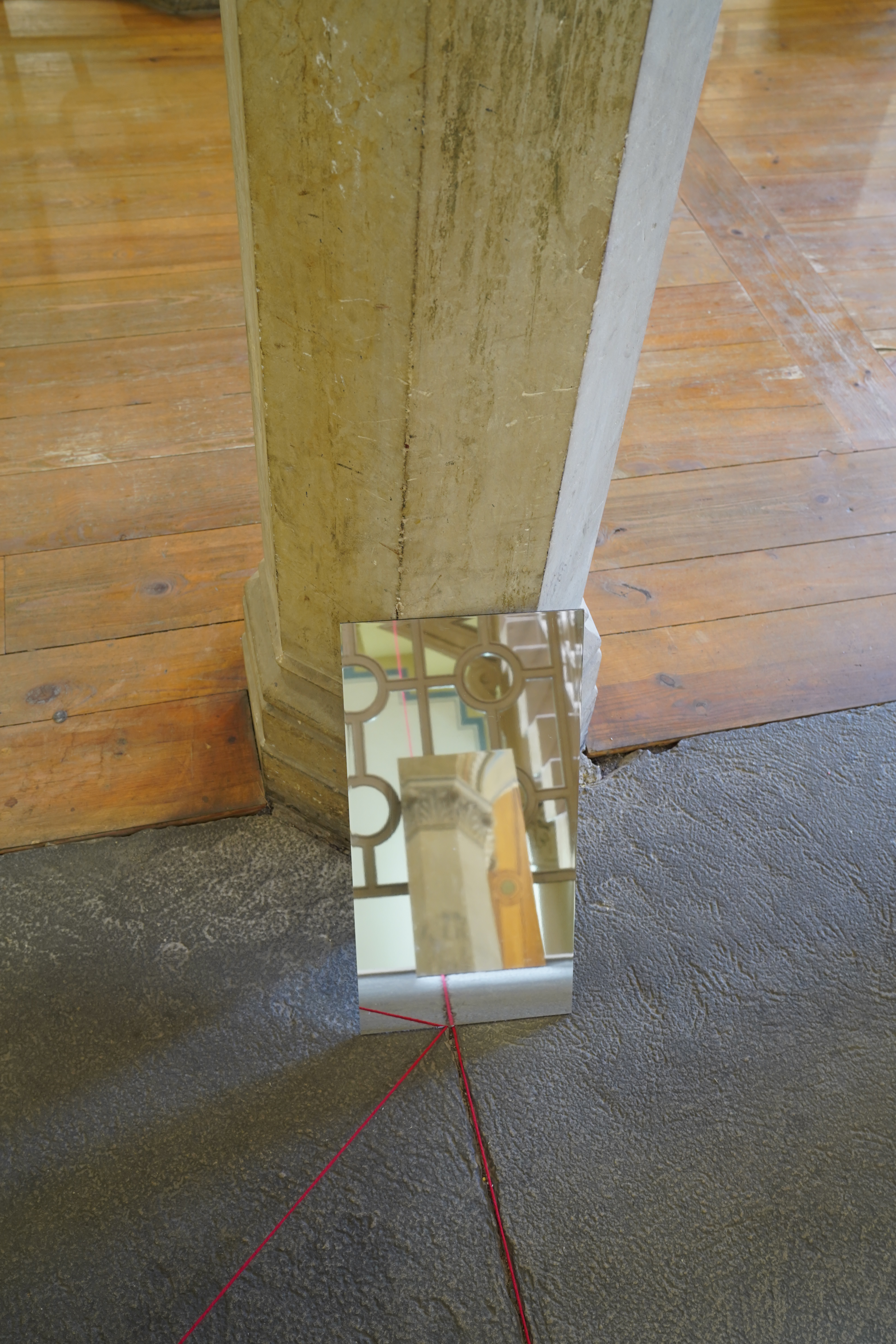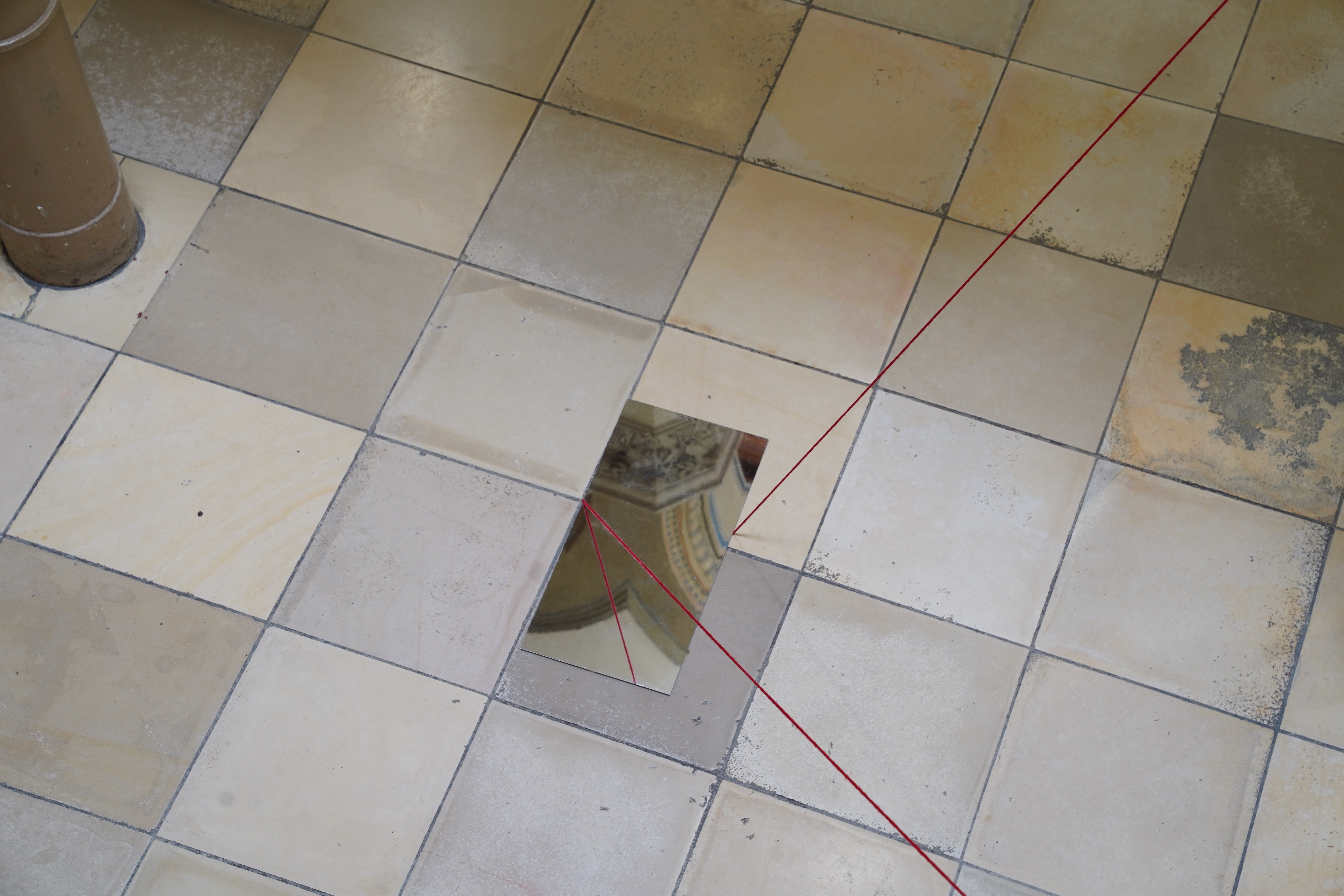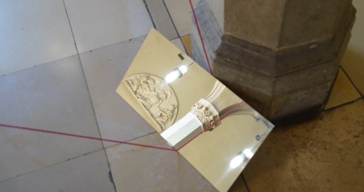 In this work she highlights fragments of the architecture of the site and its history. Through the use of mirrors, she also creates a re-reading of the space, extracting these architectural elements (reliefs, paintings, shapes, etc.) to make them visible elsewhere.
