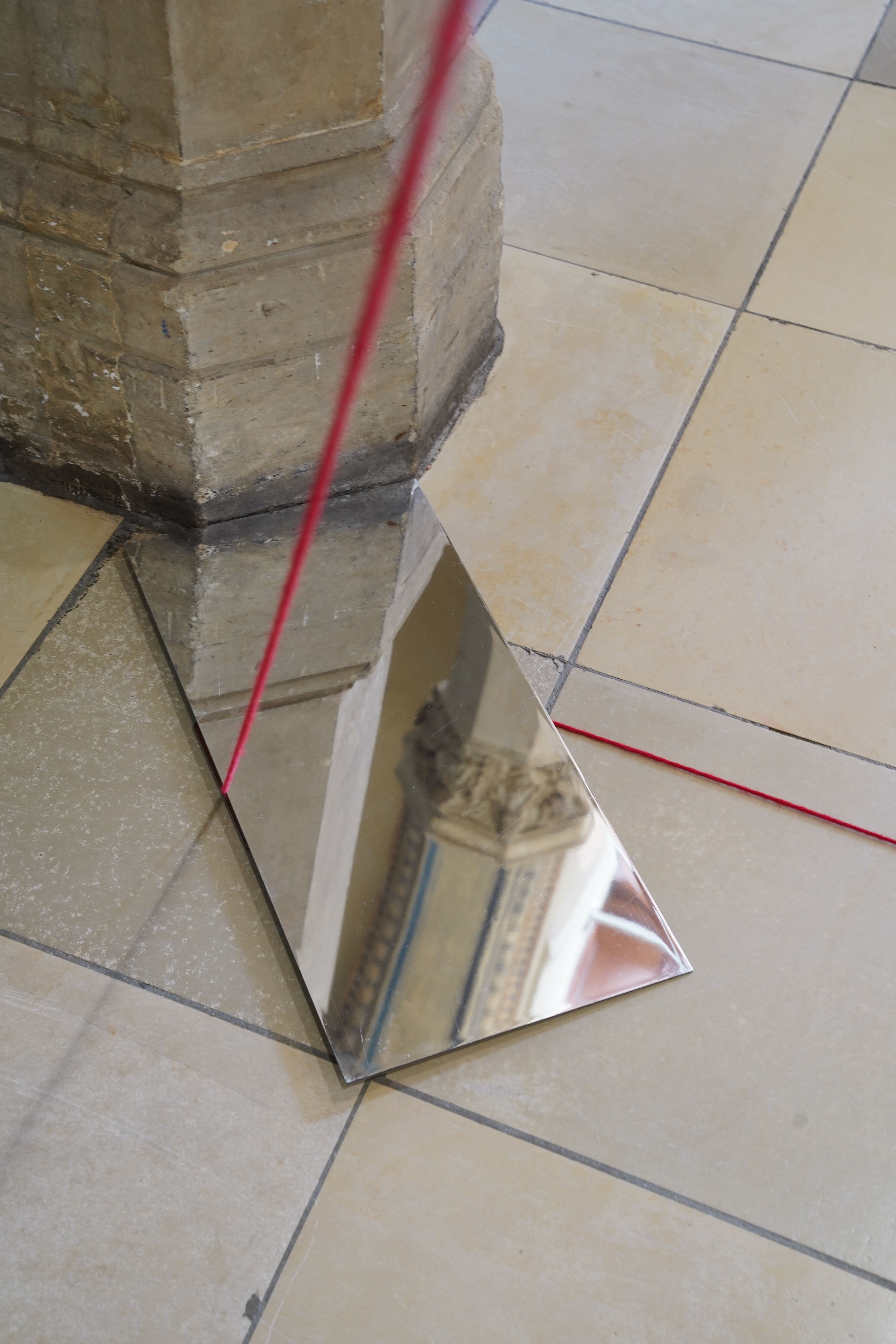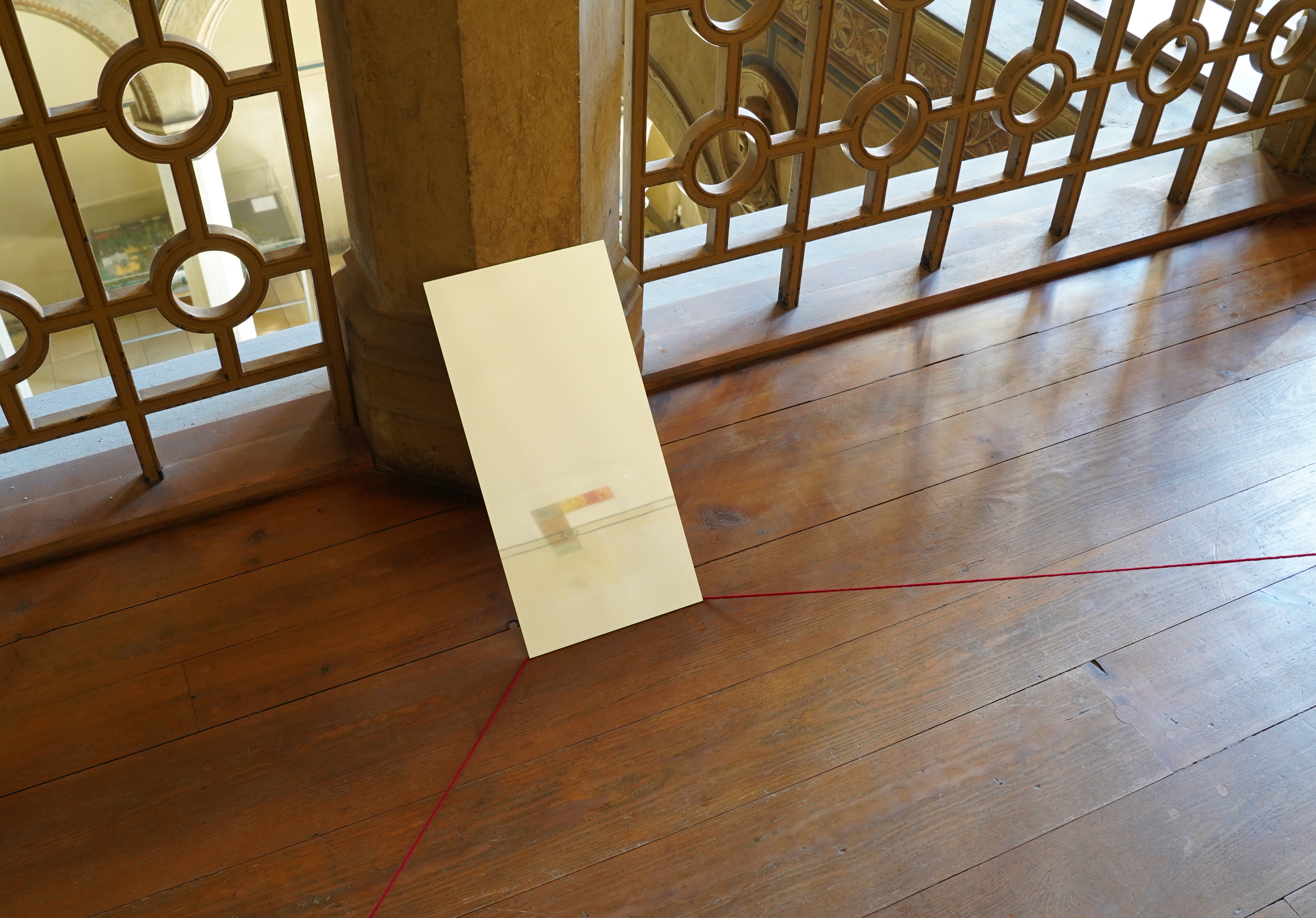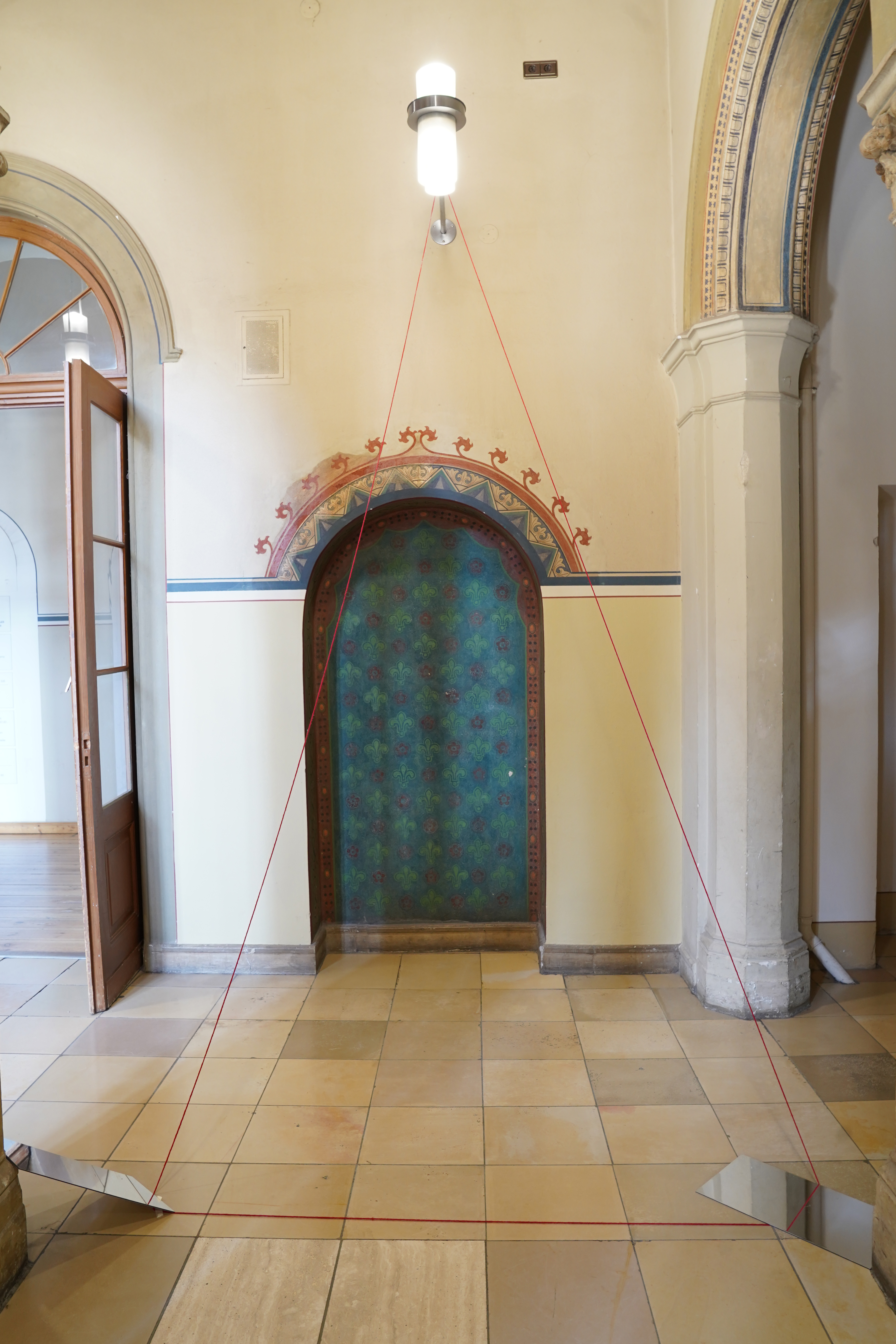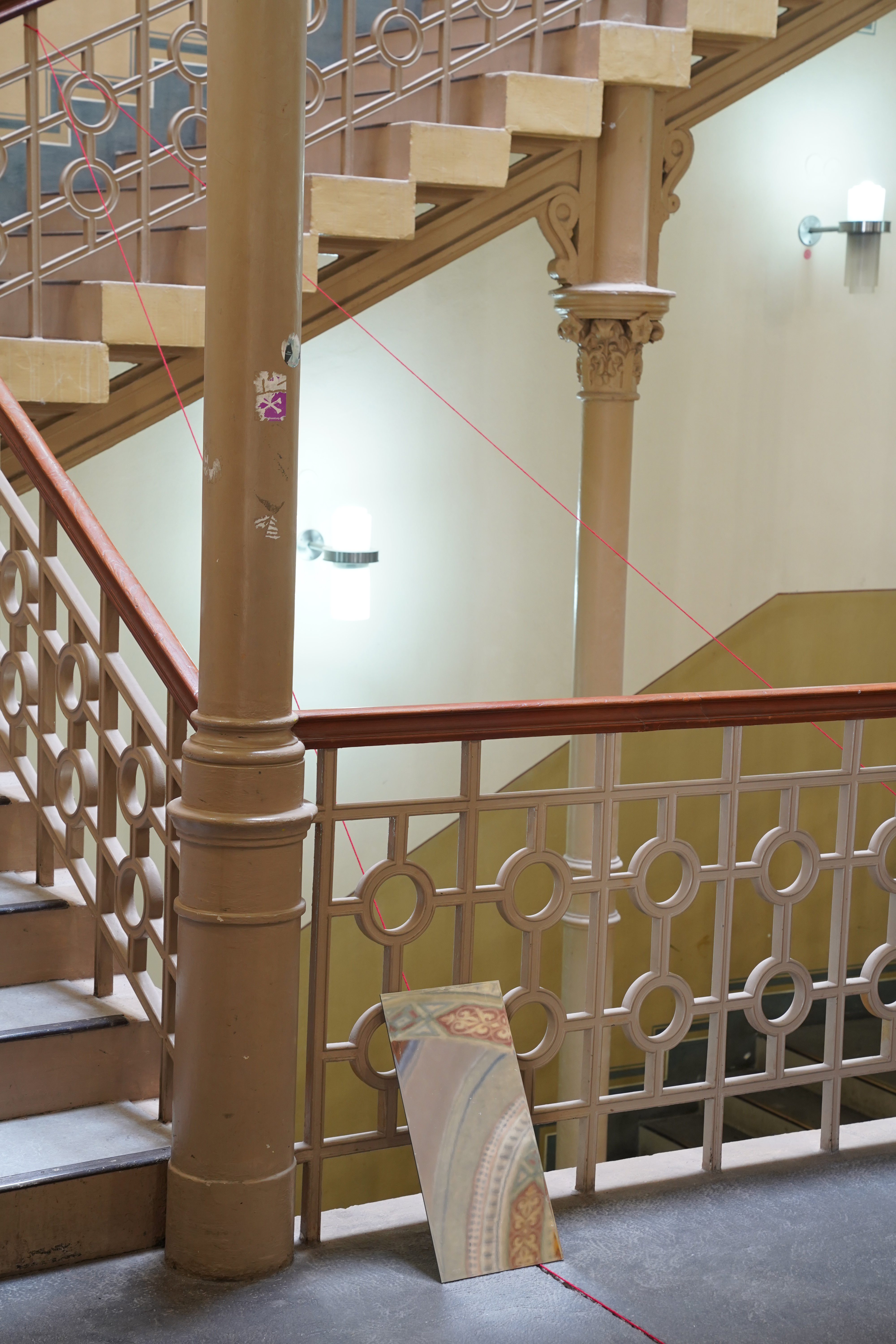 In this work she highlights fragments of the architecture of the site and its history. Through the use of mirrors, she also creates a re-reading of the space, extracting these architectural elements (reliefs, paintings, shapes, etc.) to make them visible elsewhere.