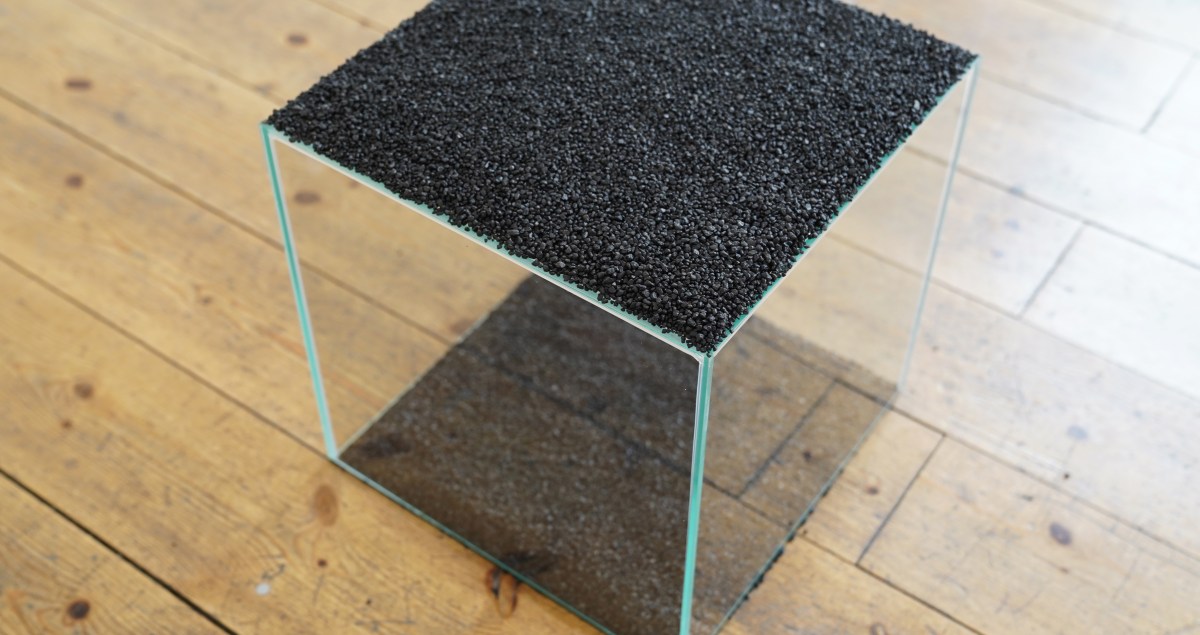 Sculptures series, 6 glass cubes 30x30x30 m. and black gravel