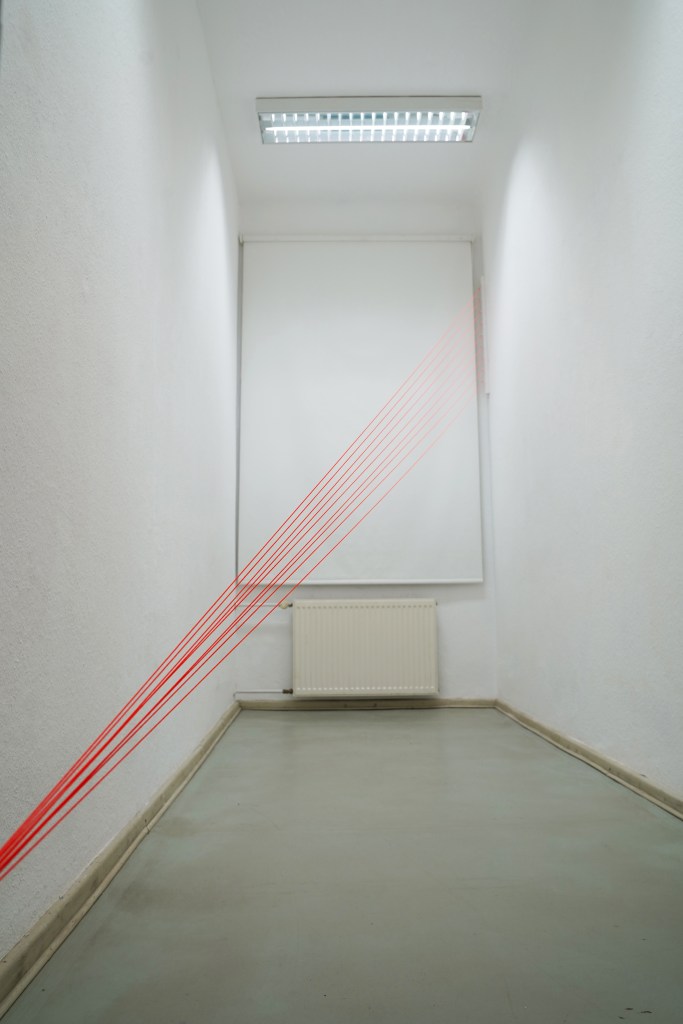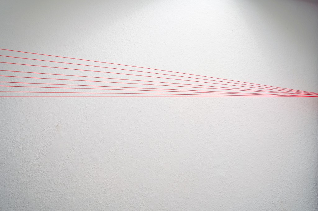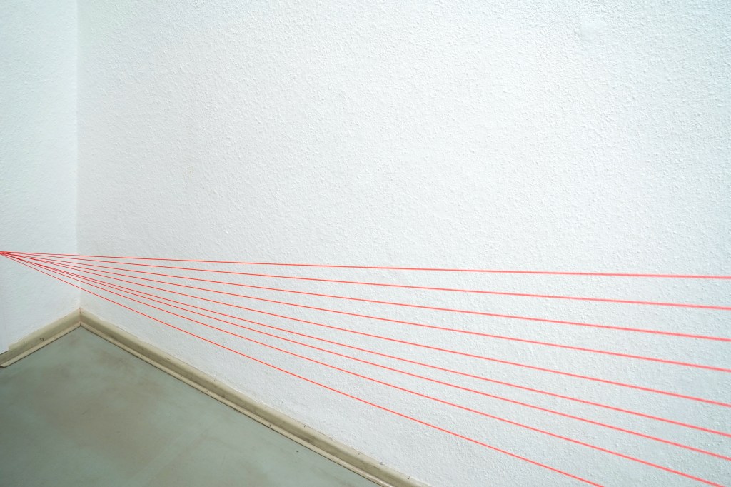 Deux pièces, deux points de fuite dans des directions opposées. Une expérience visuelle, qui amène le visiteur à se déplacer d’un espace à l’autre. De part le choix de la couleur néon, l’installation donne l’impression de flotter. Un prisme qui occupe l’espace vide d’un point à l’autre de la pièce et invite le spectateur à entrer dans cette espace, où la couleur vibre et oriente le regard.