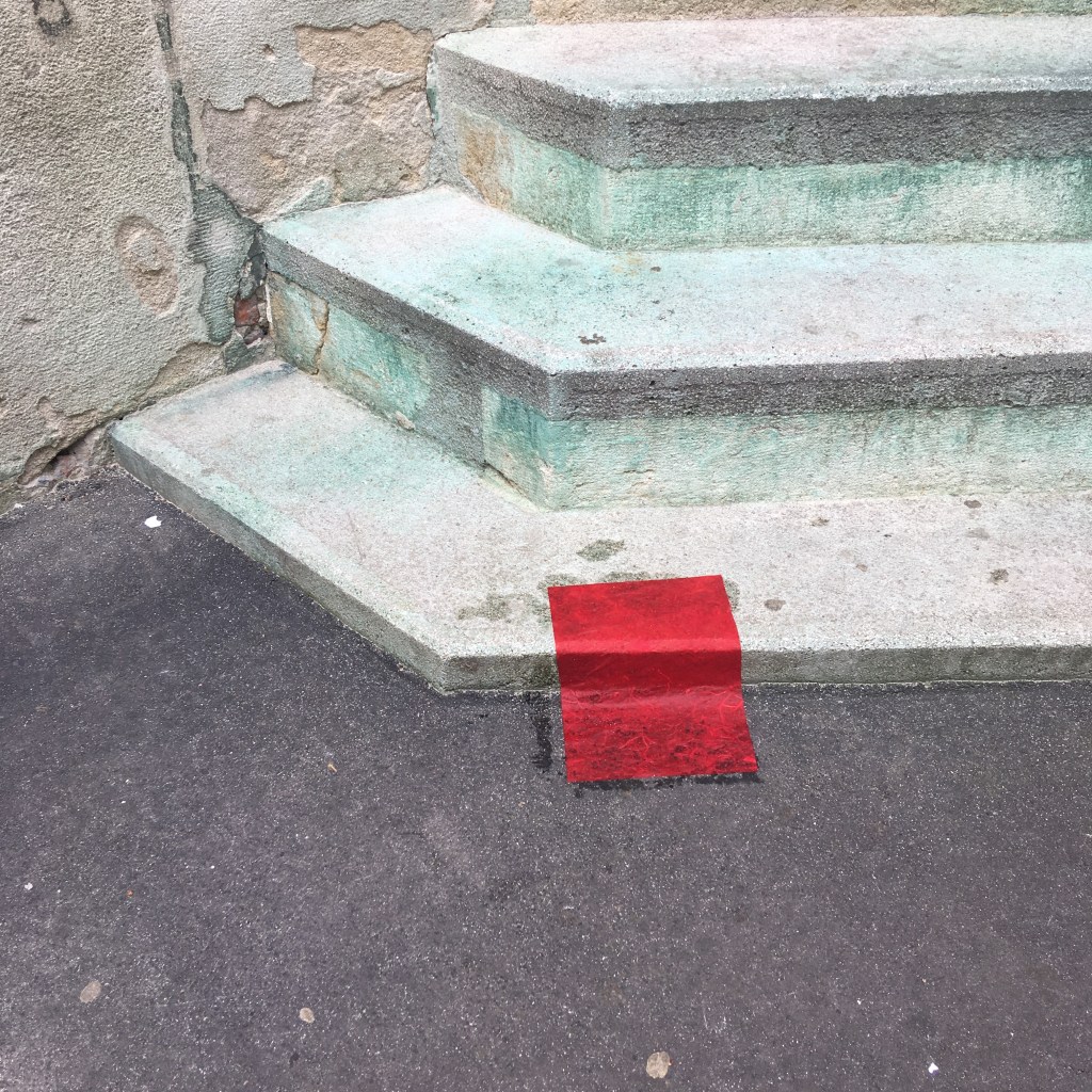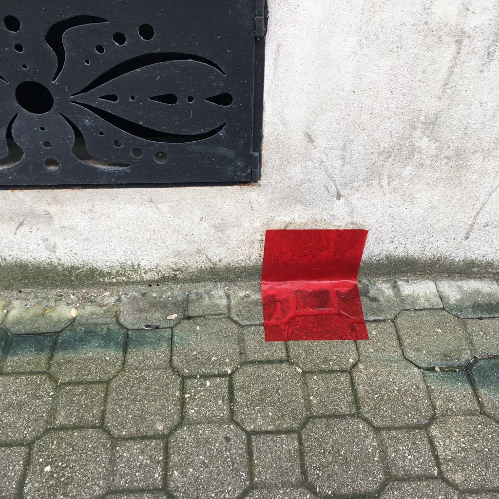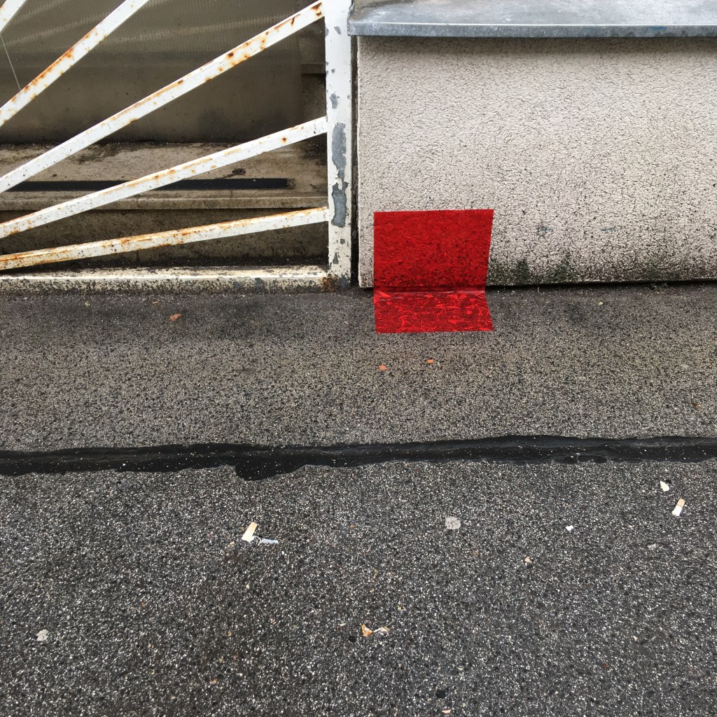I approach the theme of walking in a predefined parameter, each day during 10 days of my stay, I set out to discover Vienna by following a line drawn on the city map. Between strolling and moving, I approached the city in a partial and fragmented way; limited by the route I gave myself. On these routes I chose locations, where I carried out an intervention, putting in dialogue a graphic element belonging to the urban landscape and a rectangle of red paper. Marking my passage, I left an ephemeral trace, which I photographed, like taking a photograph of a historical monument (a wink to the tourists who all follow the same route, leaving their hotel, going from one monument to another and finally returning to the starting point, without discovering the city by themselves). At the place where the red rectangle was placed, I interrupted my walk to observe the reactions, the daily life scenes; motionless, letting myself be absorbed by the environment, just to be present at the place.