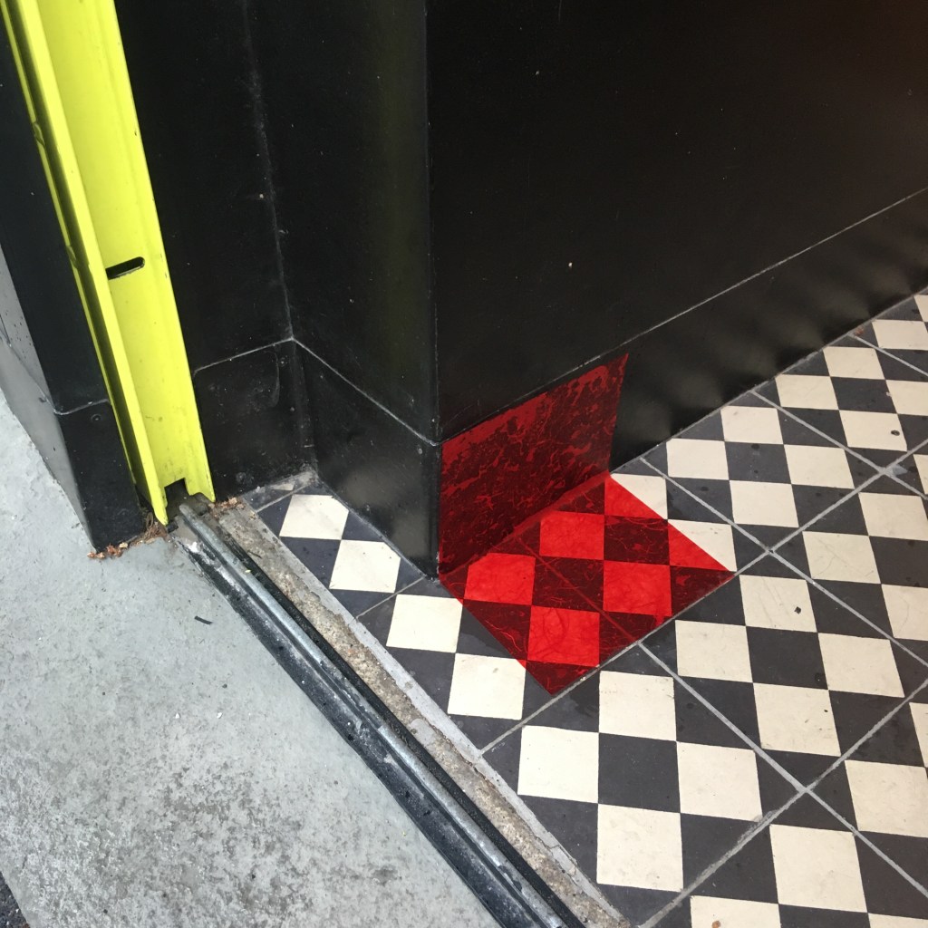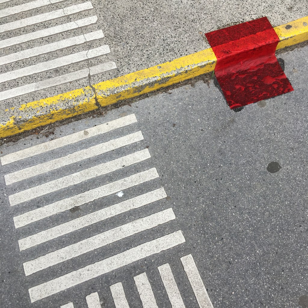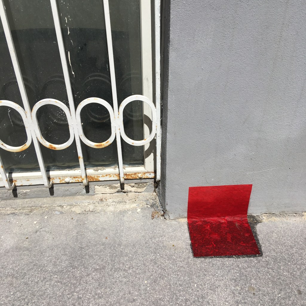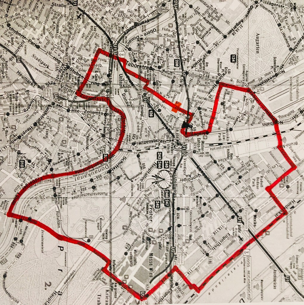 I approach the theme of walking in a predefined parameter, each day during 10 days of my stay, I set out to discover Vienna by following a line drawn on the city map. Between strolling and moving, I approached the city in a partial and fragmented way; limited by the route I gave myself. On these routes I chose locations, where I carried out an intervention, putting in dialogue a graphic element belonging to the urban landscape and a rectangle of red paper. Marking my passage, I left an ephemeral trace, which I photographed, like taking a photograph of a historical monument (a wink to the tourists who all follow the same route, leaving their hotel, going from one monument to another and finally returning to the starting point, without discovering the city by themselves). At the place where the red rectangle was placed, I interrupted my walk to observe the reactions, the daily life scenes; motionless, letting myself be absorbed by the environment, just to be present at the place.