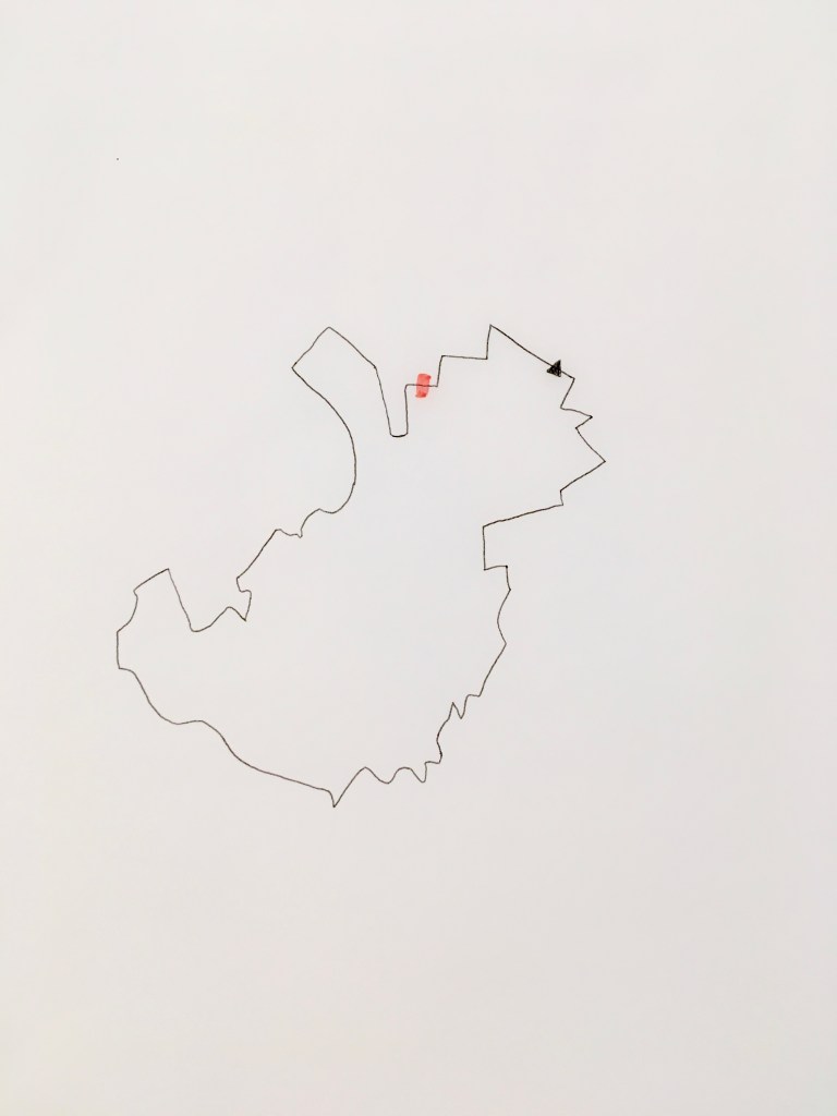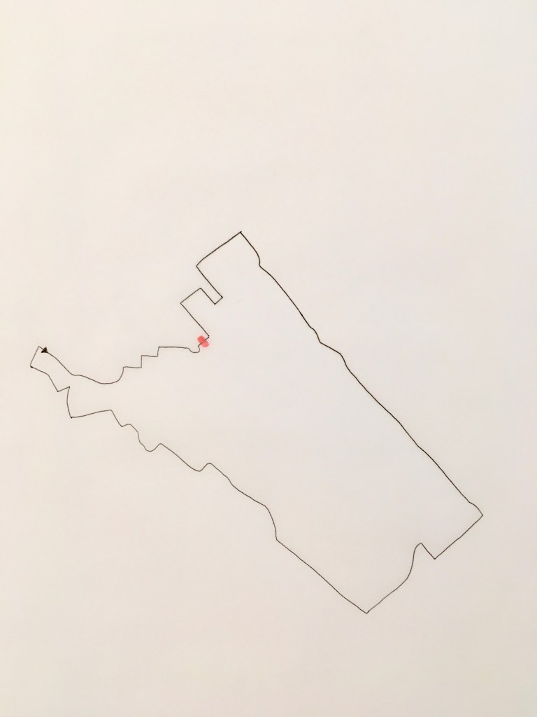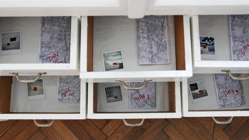 A mon retour à la galerie je déposais le polaroid prise lors de ma marche et le plaçais dans un des dix tiroirs de la galerie. J’y plaçais la photographie mais aussi le plan du trajet réalisé, avec la volonté de partager un fragment de mon expérience avec le visiteur. La marche, comme l’action de rester à un endroit juste pour observer et être dans un lieu, sont rares dans nos quotidiens de citadins. Nous marchons pour aller à, ou pour revenir de… Durant ces derniers mois de confinement, la marche était un luxe dans certains pays, quelque chose de l’ordre de l’exceptionnel, limité dans la durée et dans la distance, ce qui dénature entièrement l’essence de la marche : “Idéalement marcher est un état où l’esprit, le corps et le monde se répondent, un peu comme trois personnages qui se mettraient enfin à converser ensemble, trois notes qui soudain composaient un accord.” (L’art de marcher, de Rebecca Solnit)
