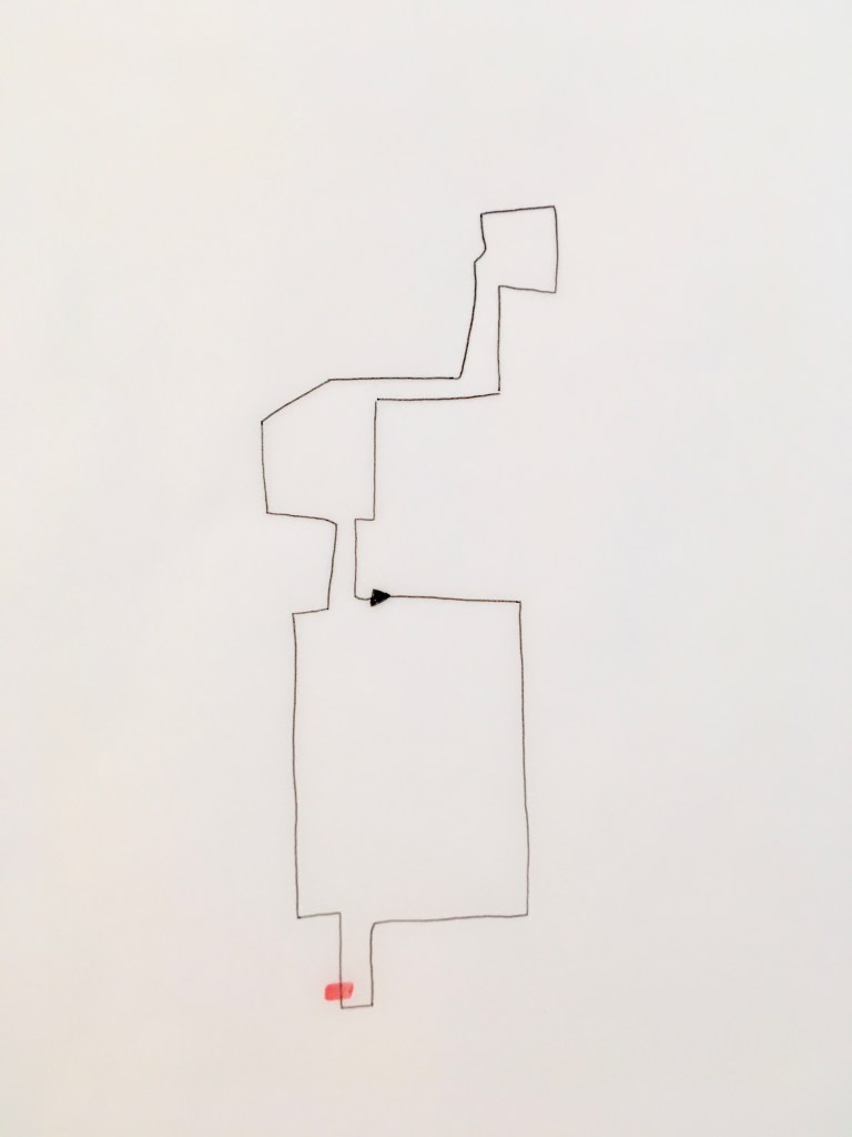 Par ailleurs, une série de dix dessins des trajets réalisés, nous rappellent qu’il est aussi question d’espace. Des cartographies abstraites qui invitent le spectateur à s’imaginer le chemin parcouru.