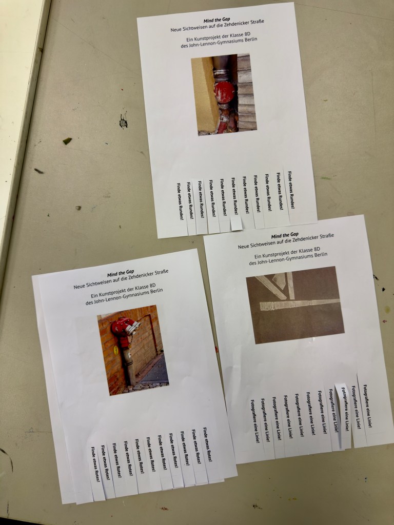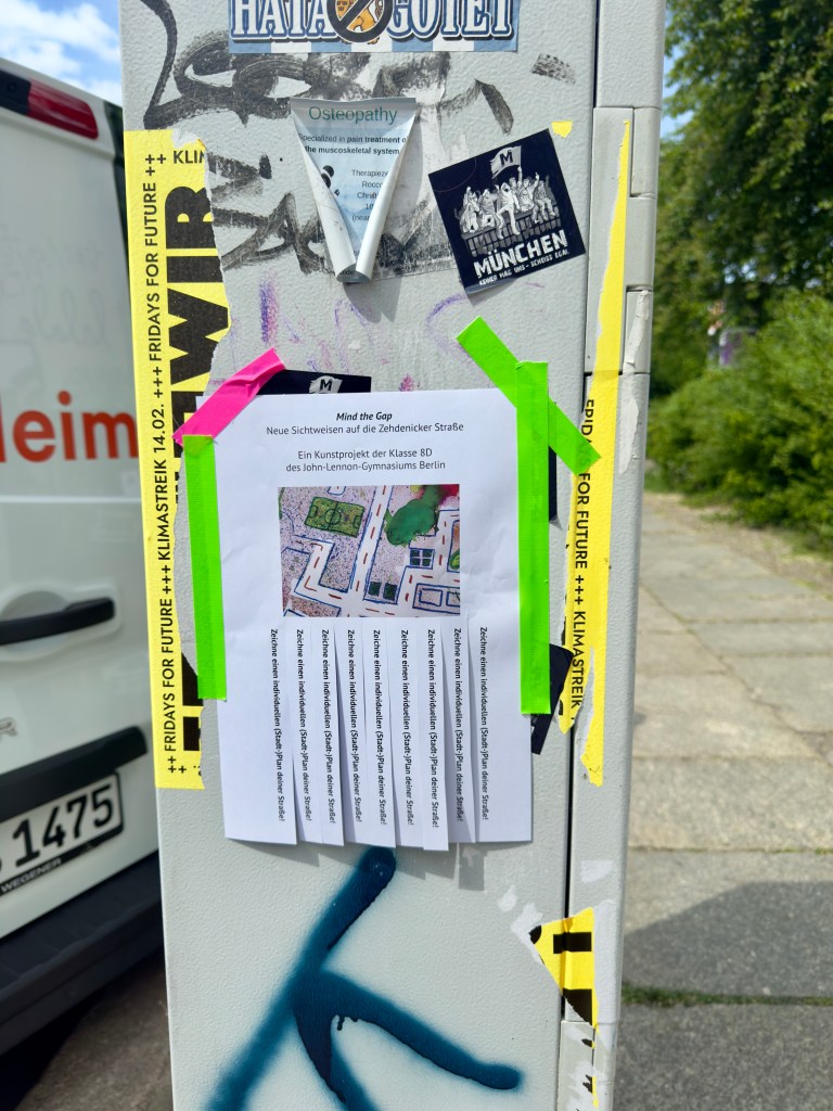 Under the title Mind the Gap, we worked with students from John Lennon High School to examine a street in the immediate vicinity and the gaps within it in terms of their future, design and entertainment potential. In this context, we experimented with performative methods as well as with photographic, video and cartographic design options (the latter incorporating various materials), which were presented at the end of the project.